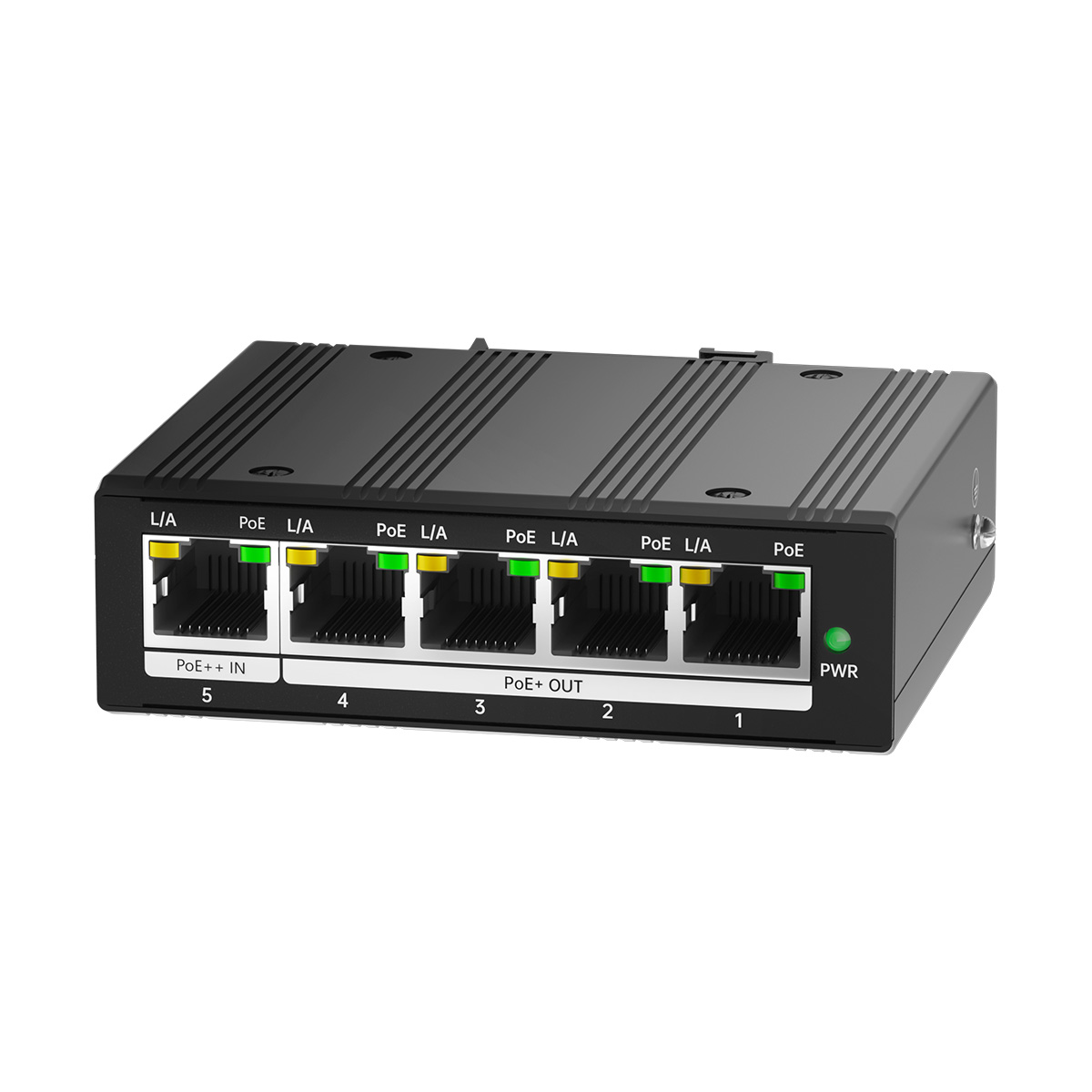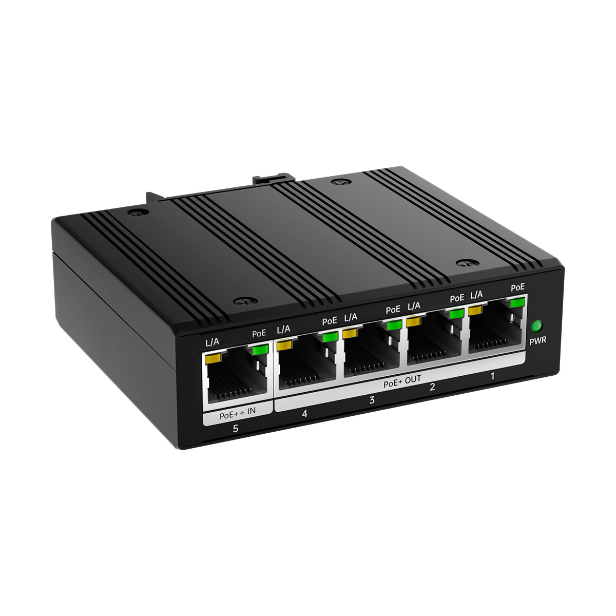 Промышленный 5-портовый PoE-коммутатор IES7211-EX04G-90W от Benchu Group предназначен для развертывания сетей в условиях ограниченного количества розеток и расстояния. Он принимает данные и до 90 Вт мощности по одному входному кабелю 802.3bt PoE++, а затем передает и то, и другое на четыре подключенных устройства, обеспечивая 30 Вт 802.3at PoE+ на порт для IP-камер, точек доступа и IoT-оборудования.